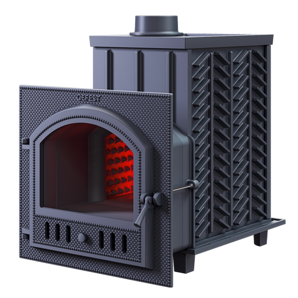 GFS-ЗК 45 (П) - печь с усиленной каменкой большей массы, с единым углублением внутрь топки для дополнительной укладки чугунного заряда. Теплосъемные шипы, со стороны горения пламени, в разы увеличивают площадь соприкосновения огня с каменкой и ускоряют передачу тепла, а также способствуют лучшему дожигу смешивая потоки пламени и воздуха поступаемого из воздушника. Эти усовершенствования значительно повышают мощность парообразования печи и выдают большее количество пара при непрерывной подаче воды. Каменка печей GFS-ЗК является незаливаемой.