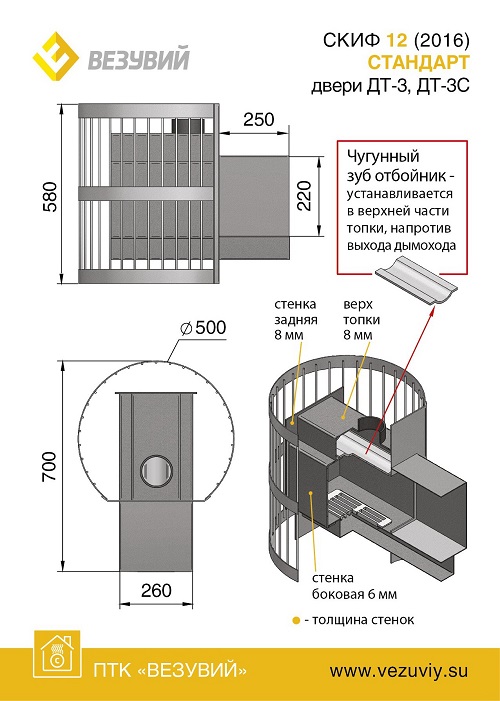 Печь - сетка Скиф-12 ВС (С) спроектирована по принципу вентилируемой открытой каменки. Открытая каменка, как следует из названия, делается таким образом, чтобы к камням был открытый доступ из парной (в отличие от закрытых каменок, когда камни располагаются внутри печи) и прямо на них можно было плеснуть воду из ковша для получения пара. Такая система помогает быстро получить оптимальное количество качественного легкого сухого пара, поскольку избыток воды сливается на пол через камни и не участвует в процессе парообразования. Колосниковая решетка топочной камеры, находящаяся в зоне наибольших температурных нагрузок, изготавливается из чугуна, она не прогорает и рассчитана на весь срок службы печи. Чугунная дверца топочной камеры с термостойким стеклом позволяет наблюдать за процессом горения дров, точно определить момент очередной закладки топлива без открывания дверцы и просто любоваться открытым пламенем.Выдвижной зольный ящик под топочной дверцей очень удобен для удаления золы, причем это можно делать даже во время работы печи. Кроме этого, в разных положениях он может изменять подачу воздуха в топочную камеру, что позволяет регулировать интенсивность горения дров. Сталь, из которой изготовлена топка банной печи Везувий Скиф 12 ВС (С), имеет толщину 8 мм, а ее состав подобран таким образом, чтобы исключить деформации при перепадах температур. Это гарантирует надежность печи и длительный срок безотказной эксплуатации. Все банные печи Везувий имеют сертификаты Ростеста, санитарно гигиеническое и пожарное заключение, они надежны и долговечны и будут служить вам долгие годы.