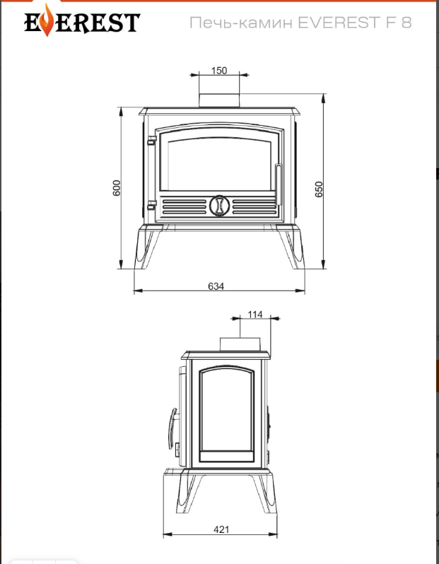 Печь-камин Эверест F8 имеет классический стиль, она подойдет и украсит любой интерьер. Печь отлита из жаропрочного чугуна высокого качества, не требует дополнительного фундамента для нее . Имеет удобную дверь для закладки дров , хороший обзор на пламя через стекло. Подача воздуха в топочную камеру осуществляется с помощью заслонки, что позволяет регулировать режим горения. Также имеется двойной дожиг повышающий КПД печи, и минимизирует остатки продуктов горения.