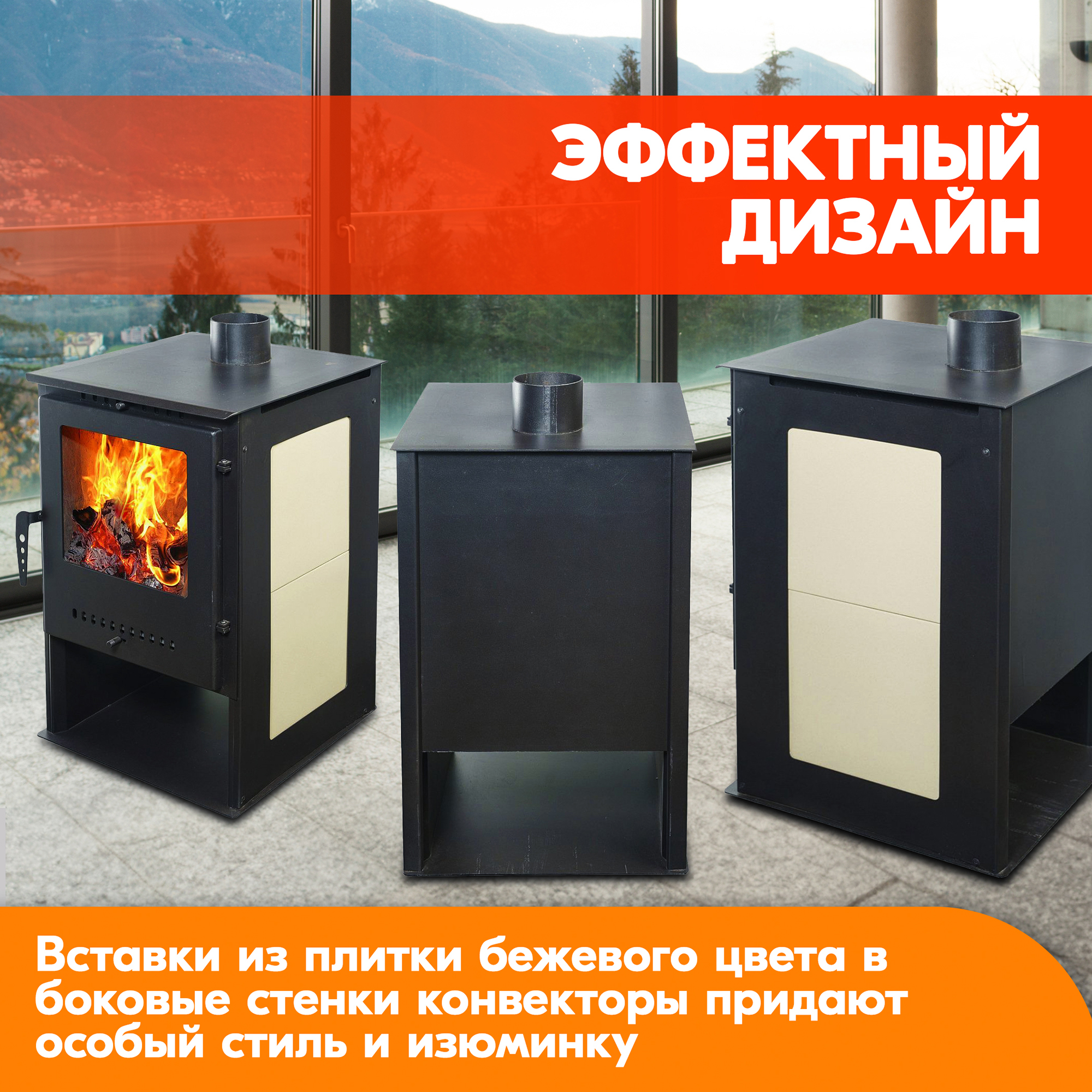 Боковые стенки-конвекторы отопительной дровяной печи-камина длительного горения оформлены контрастными вставками из плитки бежевого цвета.