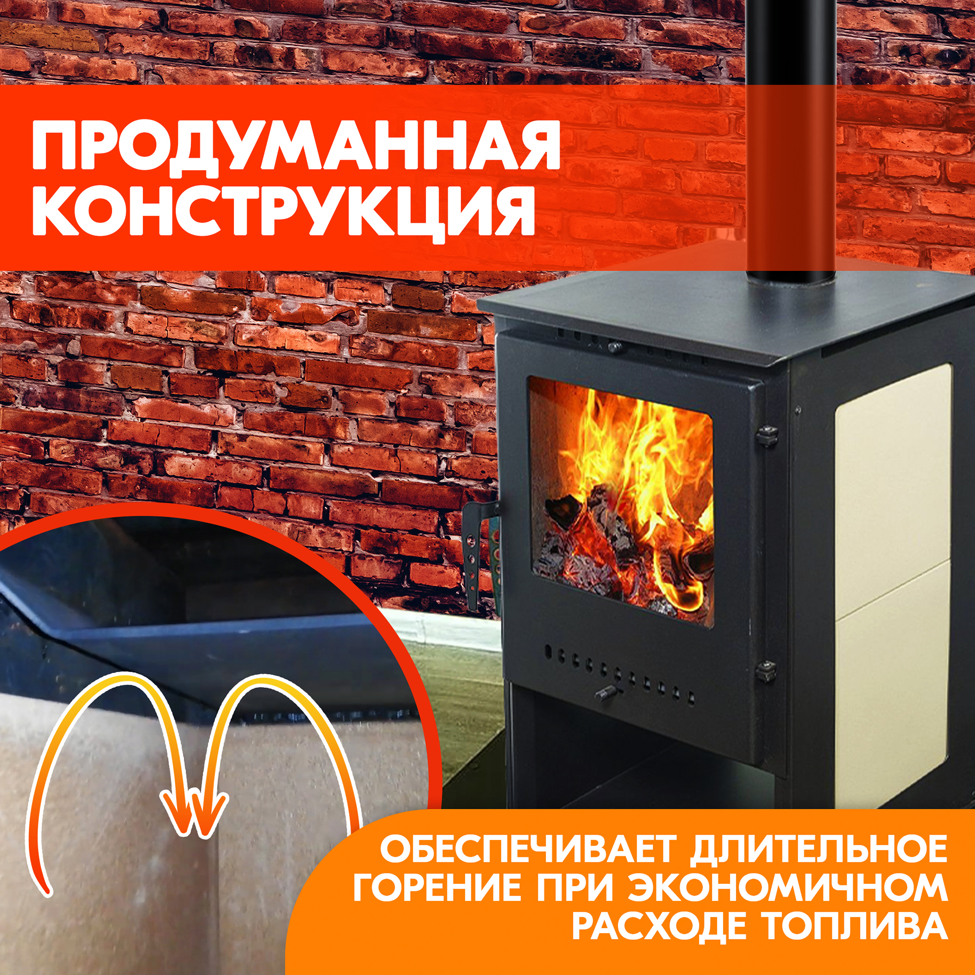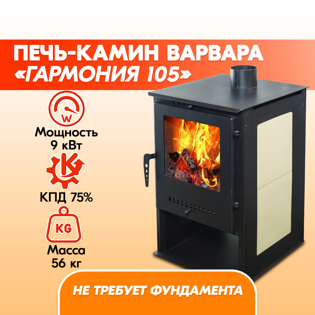 Компактная и легкая печка «Гармония 105» обладает высоким КПД в 75%, проста в эксплуатации и станет незаменимым элементом для отопления вашего загородного дома или дачи, при этом тепло в вашем доме не будет зависеть от перебоев электричества.