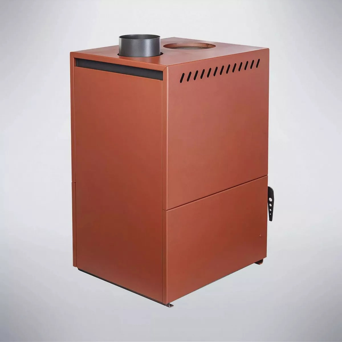 Удобная ручка печи длительного горения надежно закрывает дверцу и фиксируется в закрытом положении.