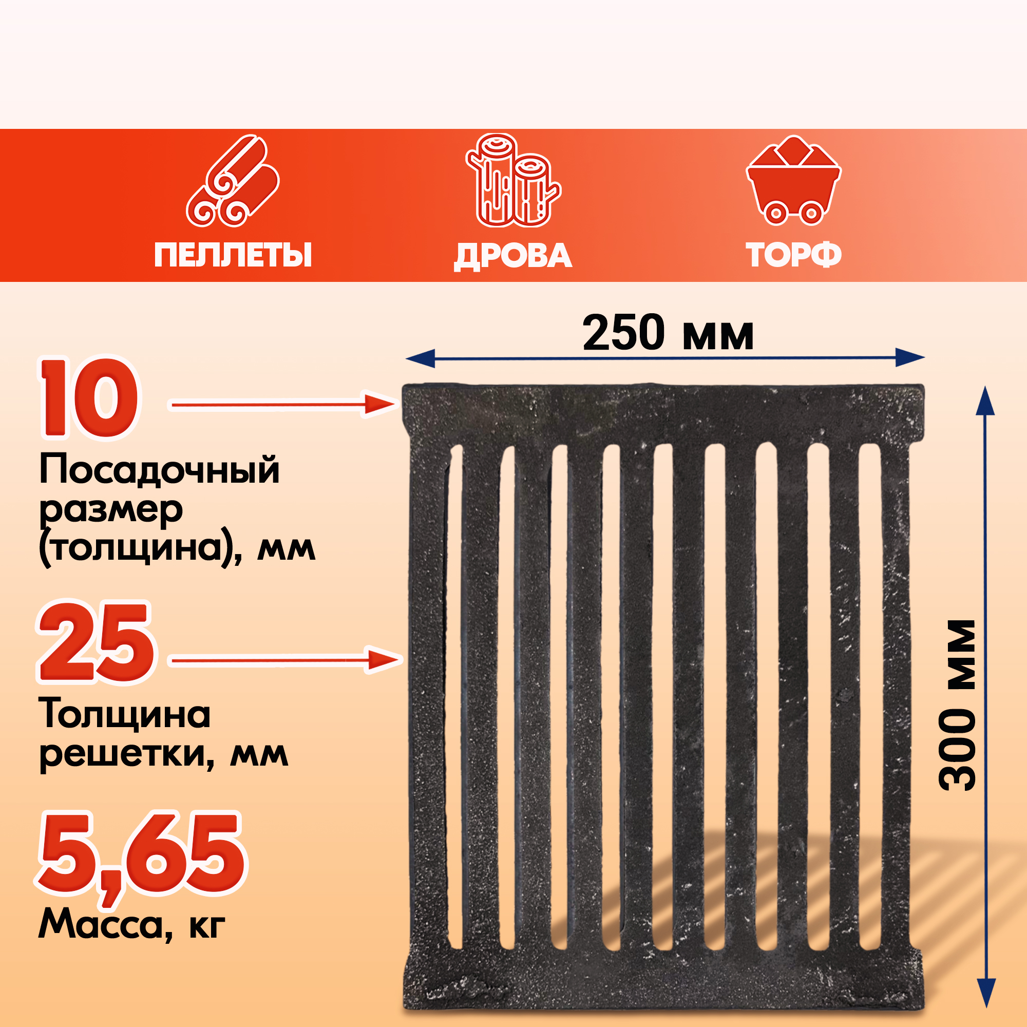 Решетка колосниковая РД-5 (300х250)чугунная для печи и котла, правильные колосники для печки и котлов