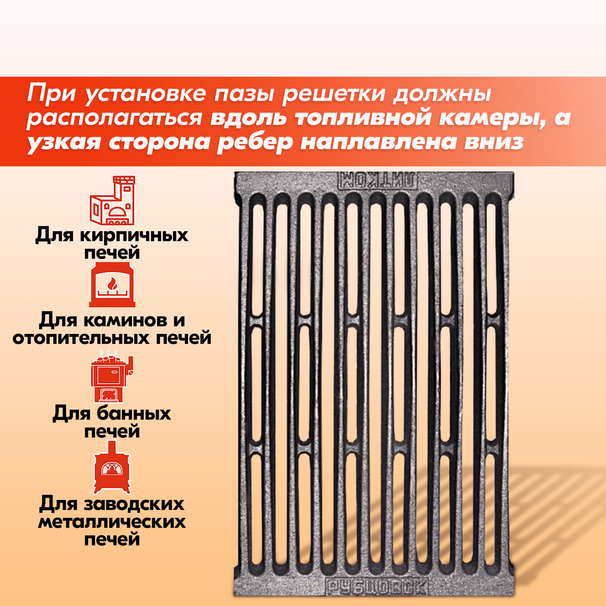 Располагать решетку колосниковую в топке обязательно узкой стороной ребер вниз, иначе срок её службы значительно снижается.